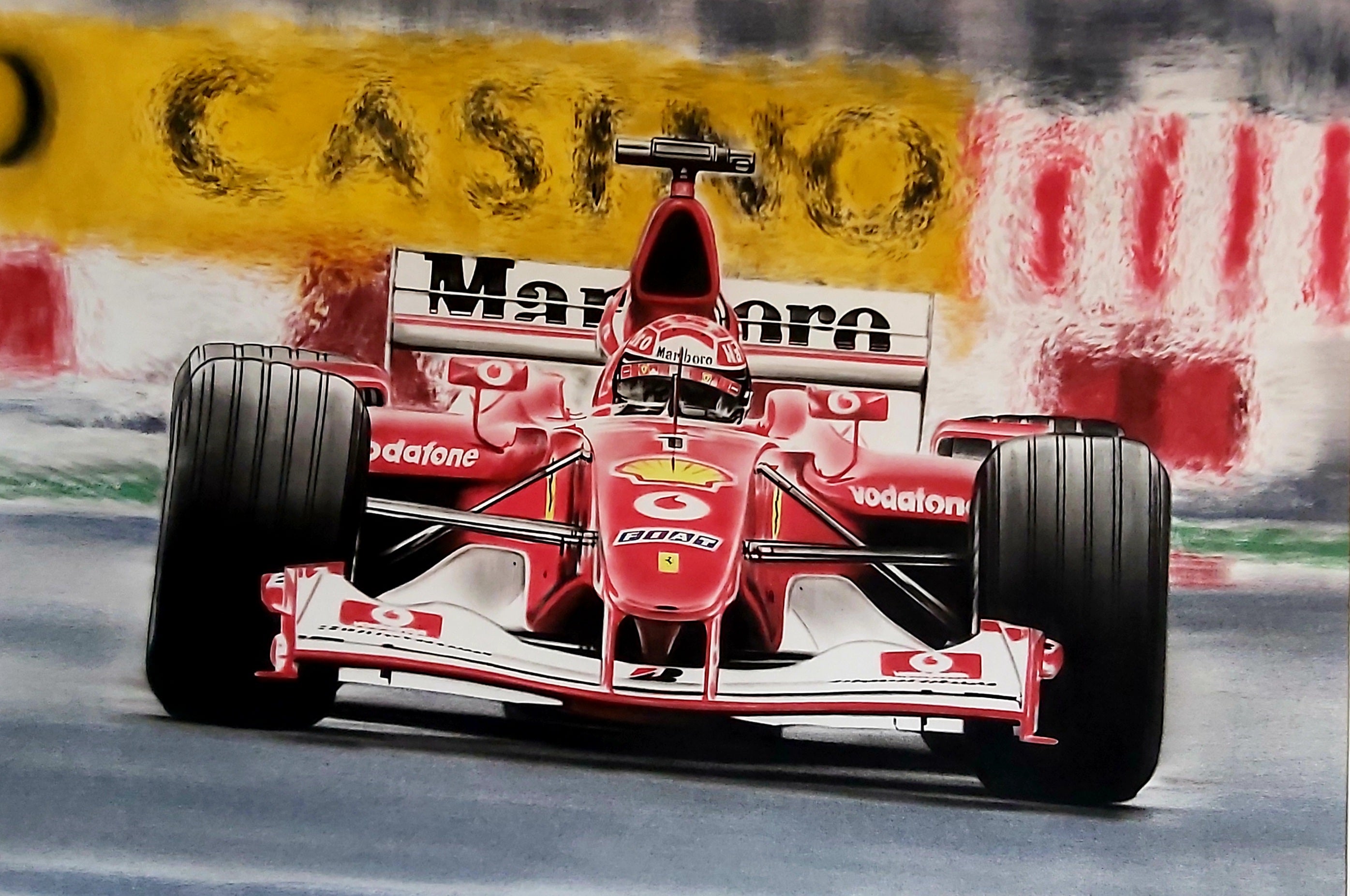 This artwork captures a pinnacle moment in Ferrari's history. The F2002 – Michael Schumacher depicts the iconic Formula 1 machine at the 2002 Canadian Grand Prix. This was a legendary race: Schumacher secured his fifth Montréal victory, and in doing so, Ferrari celebrated its 150th F1 win.